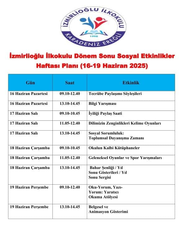 Dönem Sonu Faaliyet Haftası, 2024-2025 eğitim öğretim yılının ikinci dönemi biterken öğrencilerin keyifli ve öğretici bir hafta ile okula veda etmesini amaçlamaktadır.